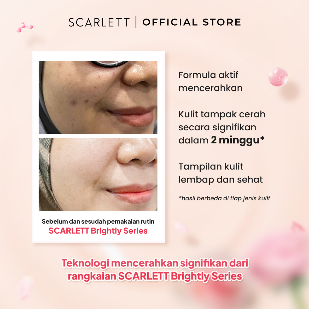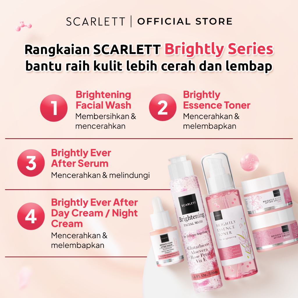 Paket skincare lengkap 5in1 dari Scarlett untuk membantu mencerahkan wajah, melembapkan kulit, dan membuat tampilan lebih glowing dengan pemakaian rutin.